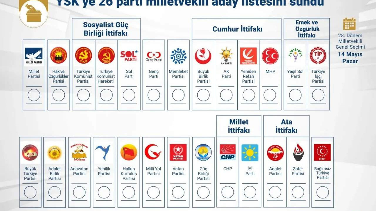 28'inci dönem milletvekili genel seçimleri için partilerin milletvekili listesini YSK'ye sunmasının ardından oy pusulası da netleşti. Pusuladaki parti sayısı ise 32'den 26'ya düştü.