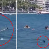 Türkiye'nin gözde tatil bölgeleri arasında yer alan Muğla Marmaris'te görülen köpekbalığı aniden ortaya çıktıktan sonra kıyıya kadar geldi. Bu sırada denizdeki yurttaşlardan biri, elindeki paspasla köpek balığını uzaklaştırmaya çalıştı.