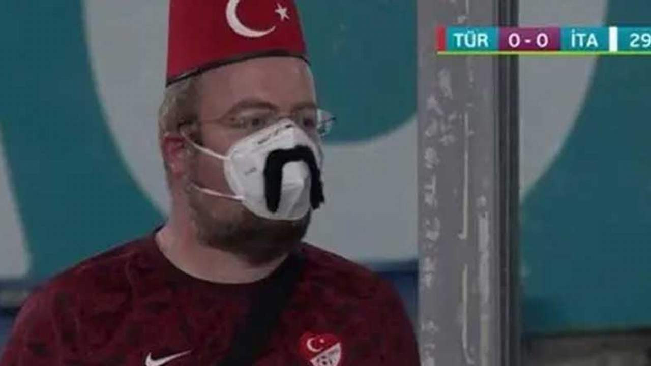 Abone OlA Milli Takımımızın İtalya'ya 3-0 mağlup olduğu karşılaşmada ekranlara gelen, kafasında fes, yüzünde üzerine yapay bıyık yapıştırılmış maskeli bir Türk taraftarın görüntüsü dikkat çekti.