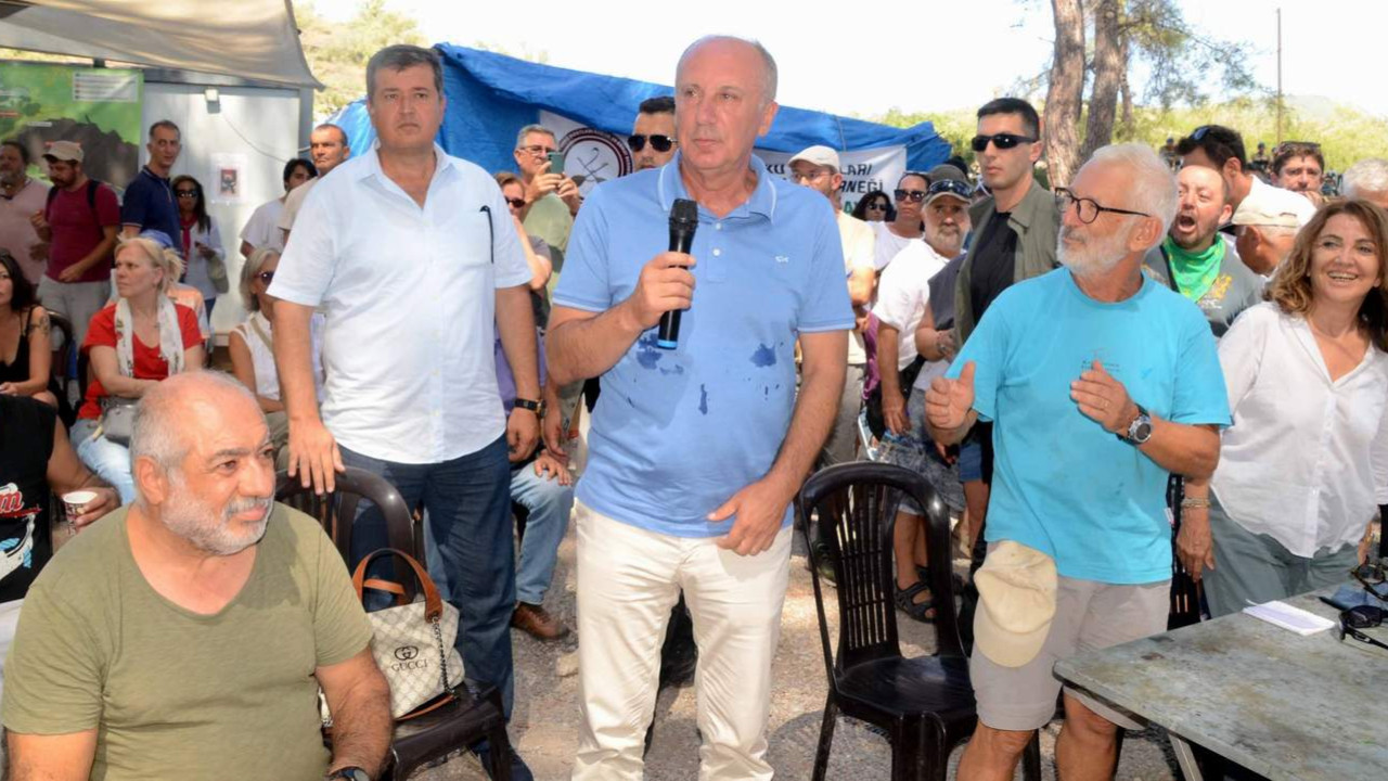 Muğla'nın Akbelen Ormanı kamp alanına jandarma ile birlikte gelen Memleket Partisi Genel Başkanı Muharrem İnce ve partili yöneticiler alkışlar, yuhalamalarla protesto edildi.