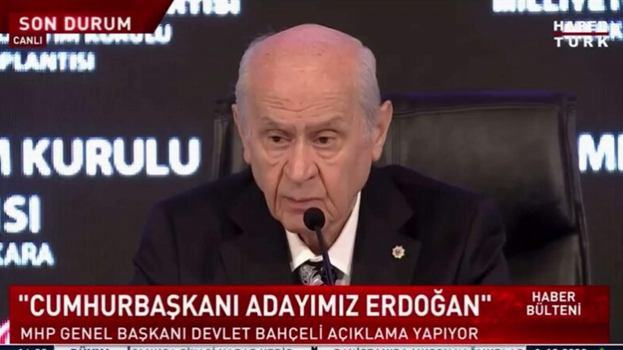 MHP Genel Başkanı Devlet Bahçeli, partisinin genel merkezinde açıklamalarda bulundu. Bahçeli 2023 seçimlerine ilişkin ise, "Cumhurbaşkanı adayımız sayın Erdoğan'dır. Yeniden seçilmesi için olağanüstü gayret sarfedilecektir." dedi.
