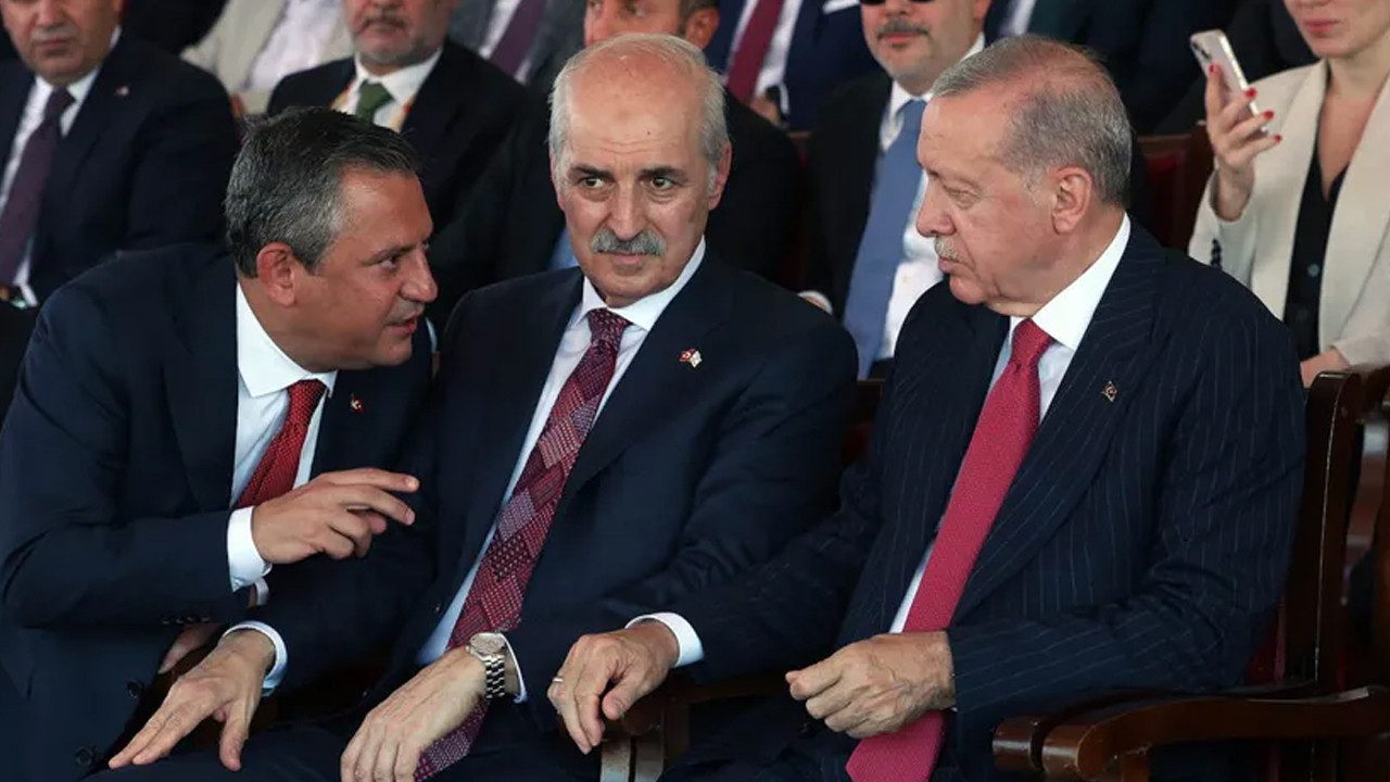 Protokol gereği, Cumhurbaşkanı Erdoğan, TBMM Başkanı Numan Kurtulmuş ve CHP lideri Özgür Özel yan yana oturdu.