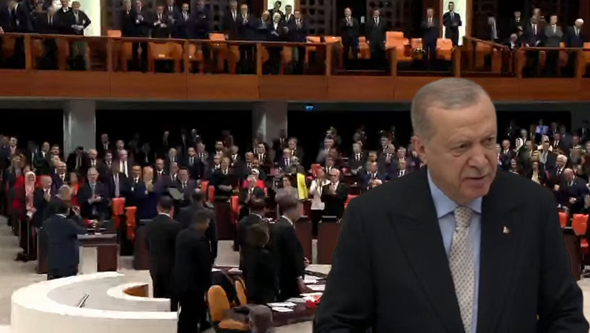 Meclis'e gelen Cumhurbaşkanı Recep Tayyip Erdoğan, Genel Kurul'daki tüm siyasi partilerin milletvekilleri tarafından ayakta karşılandı. DEM Parti milletvekilleri de, ilk kez Cumhurbaşkanı Genel Kurul'a geldiğinde ayağa kalktı.