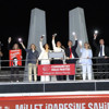 CHP Genel Başkanı Özgür Özel mitingde DEVA Partisi'nden istifa edip CHP'ye geçen İstanbul Milletvekili Evrim Rızvanoğlu ve Tekirdağ Milletvekili Cem Avşar'ı kürsüye davet ederek rozetlerini taktı.