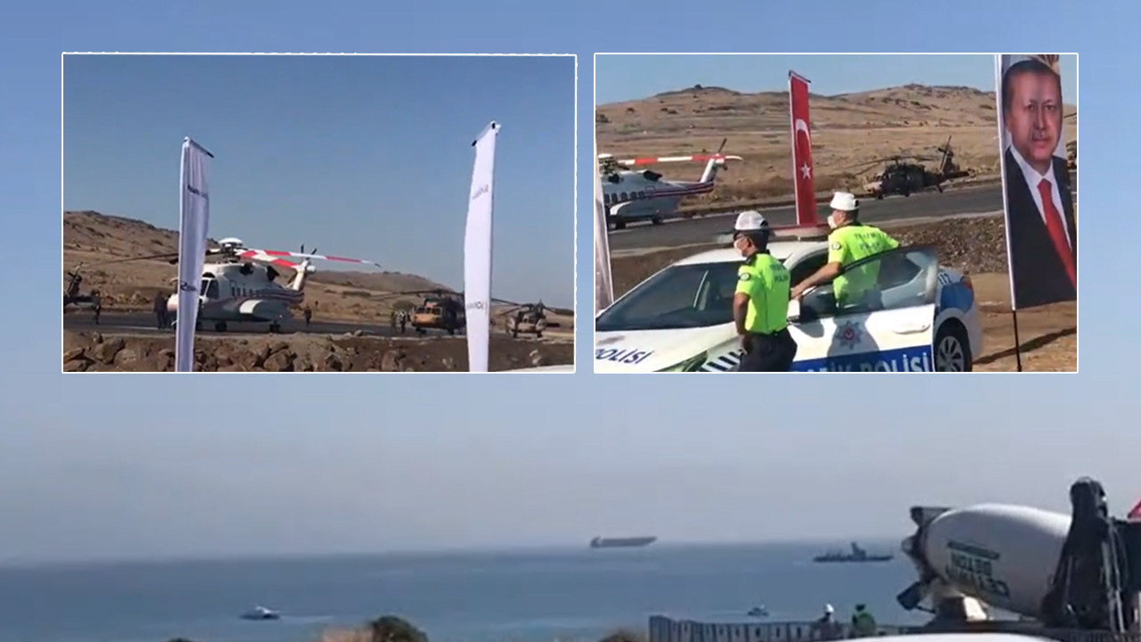 Videoda, Ceyhan Polipropilen Üretim Tesisi temel atma törenine katılan Cumhurbaşkanı Recep Tayyip Erdoğan için hazır bekleyen polisler ve helikopterler görüldü.