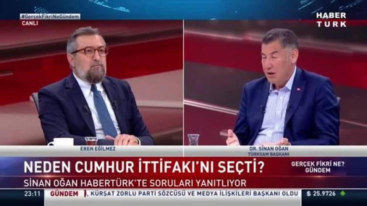 TÜRKSAM Başkanı Sinan Oğan, Habertürk ekranlarında yayınlanan 'Gerçek Fikri Ne? Gündem' programına konuk oldu. Oğan, Cumhurbaşkanlığı Seçimleri'nin ilk turu sonrasında yaşananları ve Cumhurbaşkanı Recep Tayyip Erdoğan'a neden destek verdiğini açıkladı.