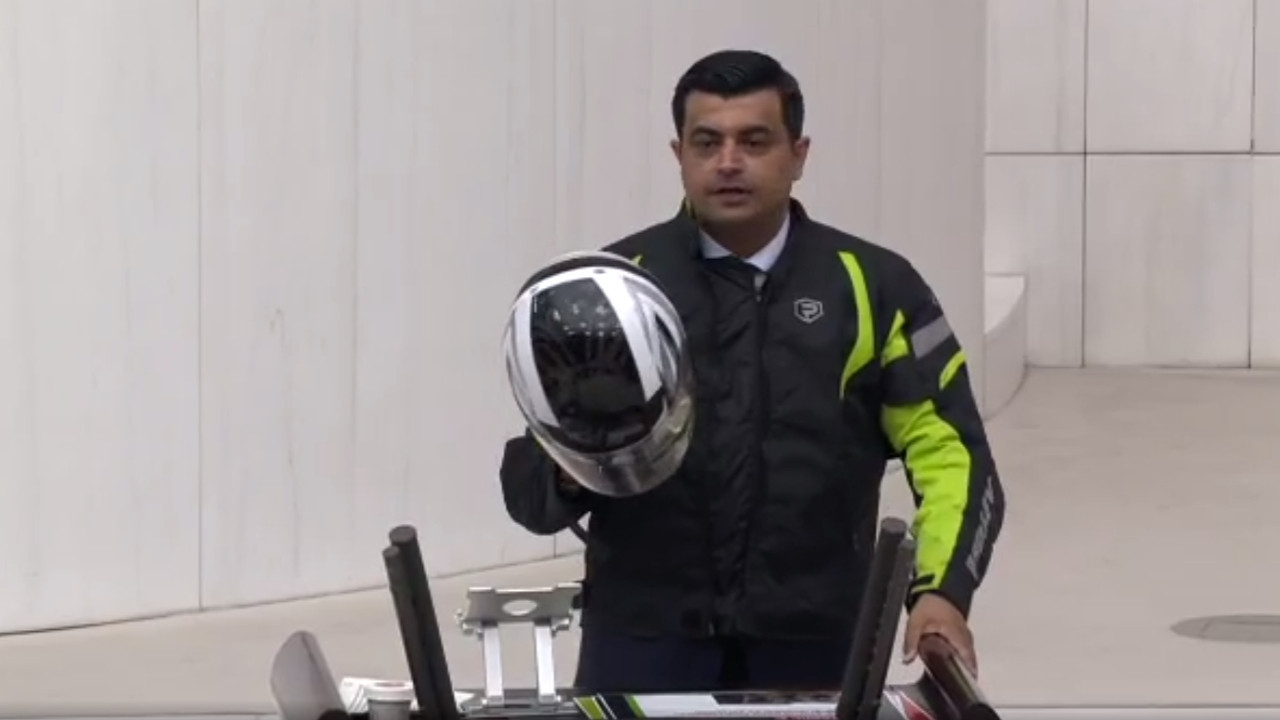 CHP Ankara Milletvekili Deniz Demir, CHP grup önerisi görüşmesinde motokuryelerin sorunlarını dile getirirken motorcu kaskı ve mont giydi.