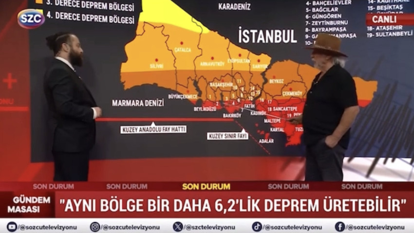 Abone OlMarmara Denizi'nde Silivri açıklarında meydana gelen 6.2'lik deprem için 3 hafta önce uyarıda bulunduğu ortaya çıkan ünlü deprem uzmanı Prof. Dr. Şener Üşümezsoy katıldığı canlı yayında İstanbul'un en riskli ilçelerini açıklarken ekrandaki harita için "bu haritayı çöpe atın" deyip 2 bölgeyi işaret ederek deprem tahminini açıkladı.