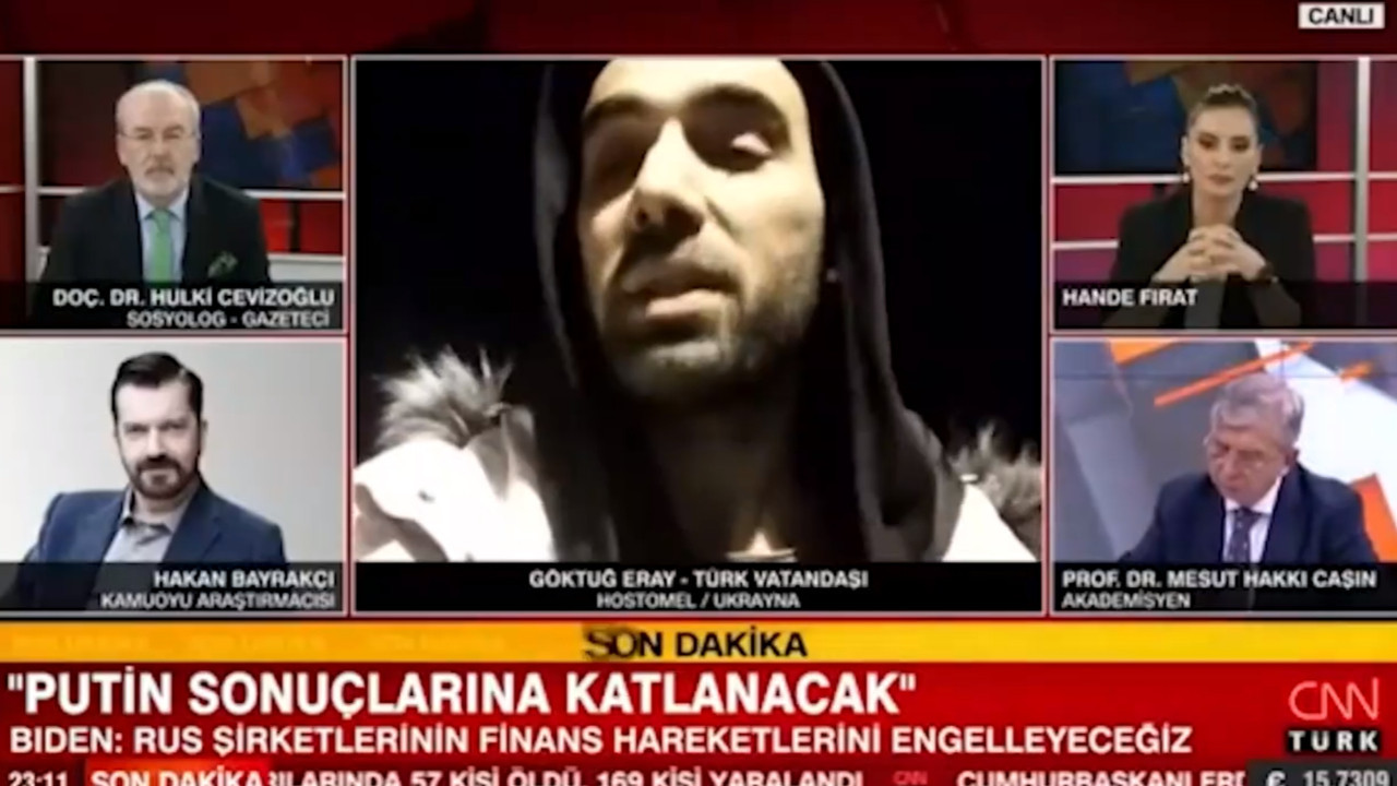 Hostomel'de eşi ve çocuğuyla yaşanan Türk vatandaşı Göktuğ Eray, "Bomba sesleriyle uyandık. Yapabildiğim tek şey eşimin ve çocuğumun elinden tutup arabaya koşmak oldu. Üzerime montumuzu alabildik sadece. ATM'ler ve kredi kartları çalışmıyor" dedi. Eray'ın yaşadıkları korku dolu anlatırken ise bomba sesleri duyuldu.