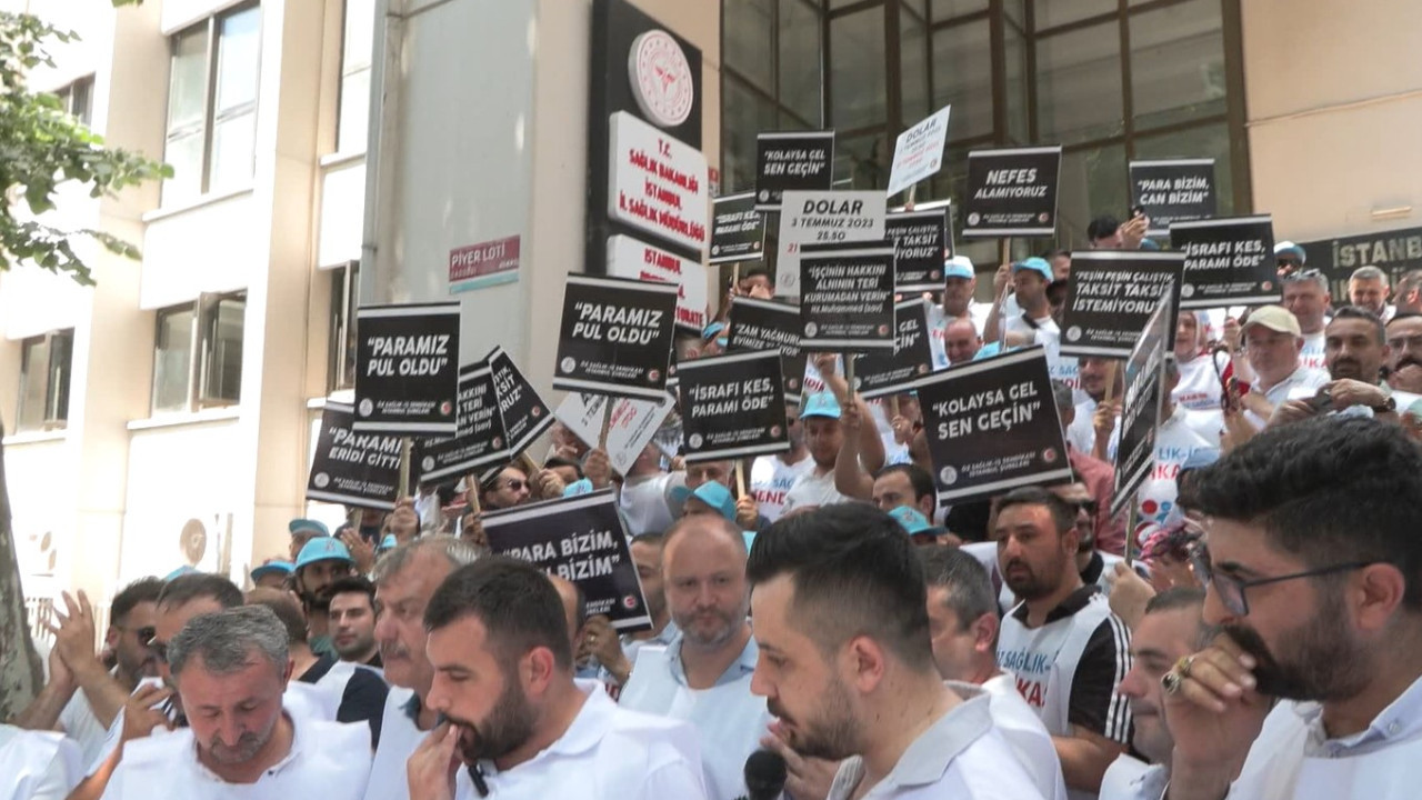 Abone Olİstanbul Fatih'te bulunan İl Sağlık Müdürlüğü binası önünde toplanan Öz Sağlık-İş Sendikası üyeleri, toplu sözleşmeden doğan geriye dönük kişi başı 70 bin TL olan ara farkların ödenmesi için basın açıklaması yaptı.
