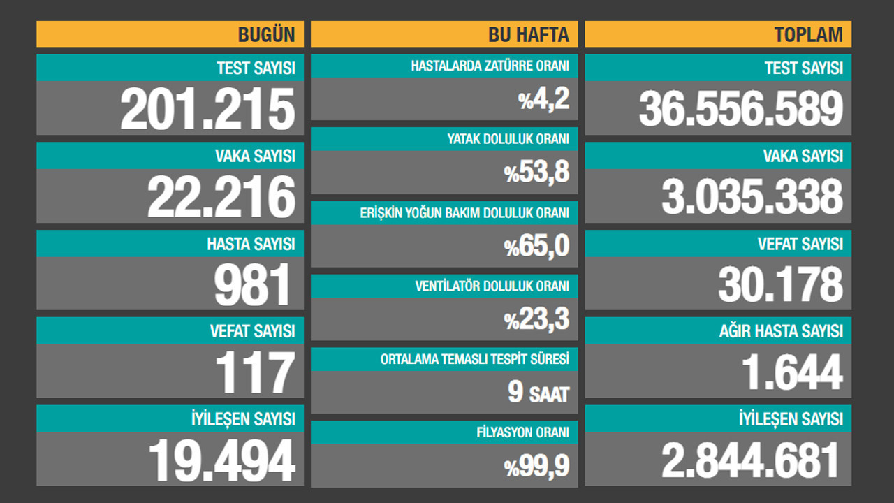 Türkiye'de son 24 saatte 201 bin 215 Covid-19 testi yapıldı, 22 bin 216 kişinin testi pozitif çıktı, 117 kişi hayatını kaybetti.