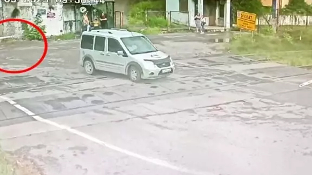 Hemzemin geçitte trenin çarpması sonucu hafif ticari aracın sürücüsü Doğan D.'nin (45) ağır yaralandığı kaza, güvenlik kamerasına yansıdı.