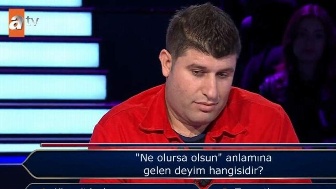 Yarışmada yarışmacının karşısına çıkan ilk soru, "Ne olursa olsun anlamına gelen deyim hangisidir?" oldu. Şıklar arasında, 'A- Kiremit kırılsa', 'B- Taş çatlasa', 'C- Kaya yarılsa', 'D- Beton aşınsa' yer aldı.