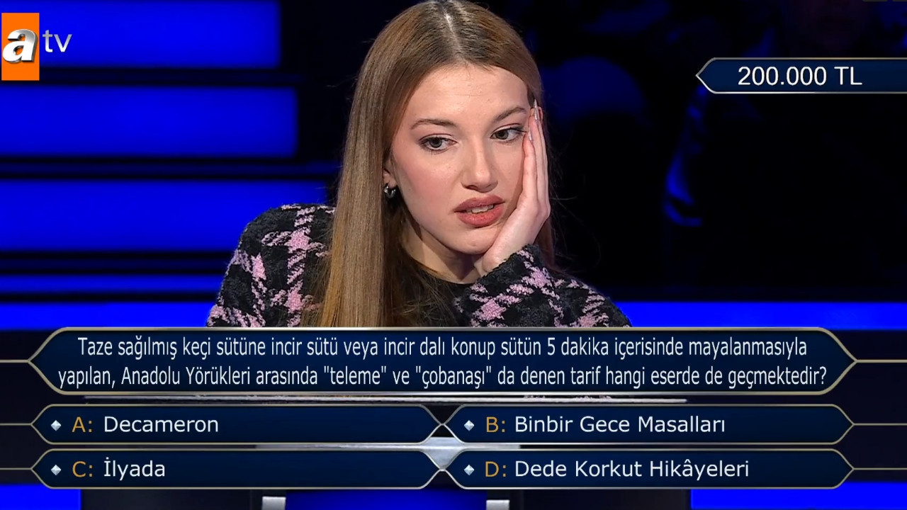 Yarışmadan çekilerek 100 bin TL'lik ödülün sahibi olan genç kadın bu soruya yanıt olarak B şıkkı, Binbir Gece Masalları dedikten sonra "iyi ki yarışmadan çekilmişim" dedi.