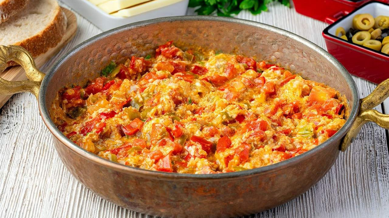 "Bugün tarihi bir gün. Eşim menemen yapmayı öğreniyor. Fatma Hanım yaptı. Soğanlı mı soğansız mı? Kuru soğan var, taze soğan var, dereotu var, maydanoz var. Bir yumurta, bol domates."
