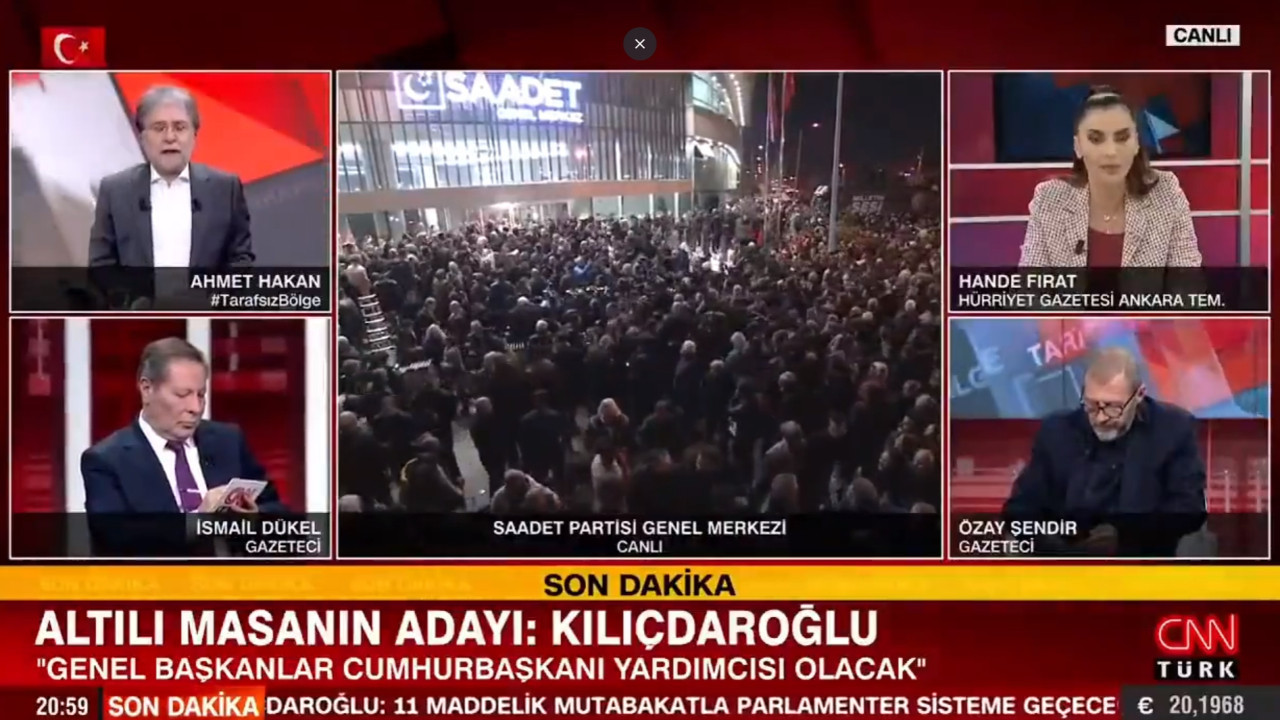Saadet Partisi Genel Merkezi’nde meydana gelen Altılı Masa’nın toplantısından sonra, Saadet Partisi Genel Başkanı Temel Karamollaoğlu, Altılı Masa’nın Cumhurbaşkanı Adayı’nın Kemal Kılıçdaroğlu olduğunu açıkladı.