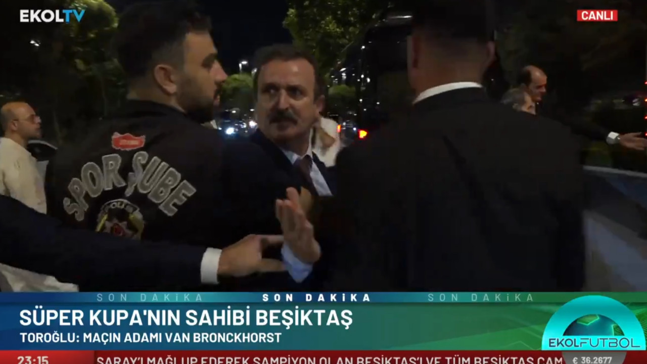 Galatasaray, Süper Kupa karşılaşmasında Beşiktaş'a farklı kaybetti. Ekol TV muhabiri Sezgin Gelmez ve kameraman Buğra Arslan, çıkışta Galatasaray Başkanı Dursun Özbek'in görüntüsünü almaya çalıştı.