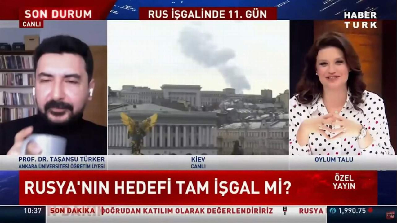 Habertürk TV’de, Oylum Talu, Ukrayna Özel Yayını’nda Ankara Üniversitesi Siyasal Bilgiler Fakültesi Karşılaştırmalı Siyaset Anabilim Dalı Başkanı Prof. Dr. Taşansu Türker’i ağırladı. Oylum Talu “Siz aynı zamanda emekli askersiniz… Biraz askeri hareketliliği de değerlendirmek istiyorum sizle” diyerek söze başlayınca Prof. Dr. Taşansu Türker “Emekli asker değilim” diye yanıt verdi. Oylum Talu bunun üzerine “Biliyorum değilsiniz ama, şundan kaynaklı söyledim. Açıklamalarınız, yaklaşımlarınız askeri hareketlere de çok yakın ve çok net bir şekilde, açık bir şekilde aktardığı için söyledim. Biraz askeri hareketliliği de konuşalım diye bir girizgah yaptım aslında…” ifadelerini kullandı.