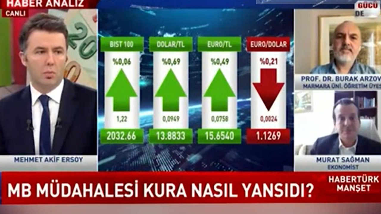 Mehmet Akif Ersoy, programına bağlanan Prof. Dr. Burak Arzova ile ekonomist Murat Sağman ile son gelişmeleri değerlendirdi. Sağman, vatandaşın enflasyondan korunmak için döviz aldığını söyledi. Faiz indirimine devam ettikçe dövizdeki dolarizasyonun artacağını vurgulayan Sağman'a yanıt veren Ersoy, "Dolar şu an 13.88 oldu, aynı yere geldi" ifadelerini kullandı.