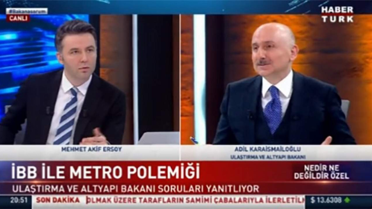 Ulaştırma ve Altyapı Bakanı Adil Karaismailoğlu, HaberTürk TV'de gazeteci Mehmet Akif Ersoy'un konuğu oldu. Bakan'ın, Kılıçdaroğlu ve CHP'li belediyeler hakkındaki iddiaları üzerine canlı yayına bağlanmak isteyen CHP Mersin Milletvekili Ali Mahir Başarır'ın Habertürk TV'ye tepki göstermesinin ardından eleştirilere cevap veren Ersoy, "Kılıçdaroğlu'ndan talep gelmedi" dedi.
