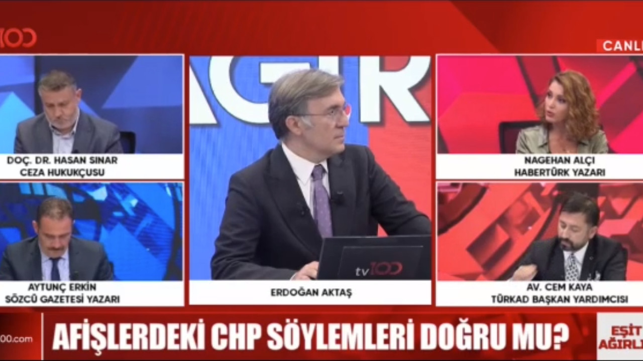 TV100 ekranlarında Erdoğan Aktaş’ın moderatörlüğünü yaptığı “Eşit Ağırlık” programında gazeteci Nagehan Alçı ile Sözcü Gazetesi Yazarı Aytunç Erkin arasında gerginlik yaşandı. Kendisini muhalefet olarak tanımlayan Nagehan Alçı'ya, "Muhalefet olarak kendinizi nerede görüyorsunuz?" diye soran Erkin, cevap alamadı.