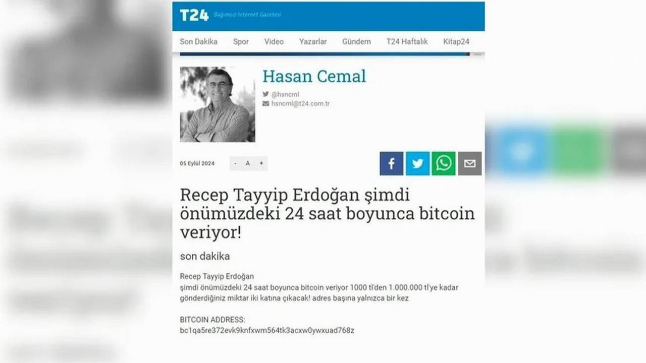 T24 haber sitesinin hacklenmesi sonucu, Hasan Cemal imzasıyla korsan yazı yayımladı. Yazıda Cumhurbaşkanı Recep Tayyip Erdoğan'ın Bitcoin dağıttığı ileri sürüldü, "Recep Tayyip Erdoğan şimdi önümüzdeki 24 saat boyunca bitcoin veriyor!" başlığı kullanıldı.