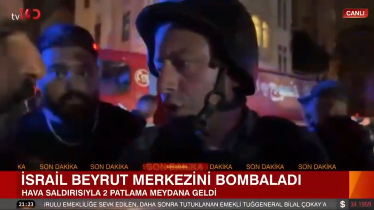 Abone Olİsrail'in Lübnan'ın başkenti Beyrut'ta düzenlediği saldırı sırasında yaşananları aktaran tv100 muhabiri Sertaç Murat Koç canlı yayında saldırıya uğradı.