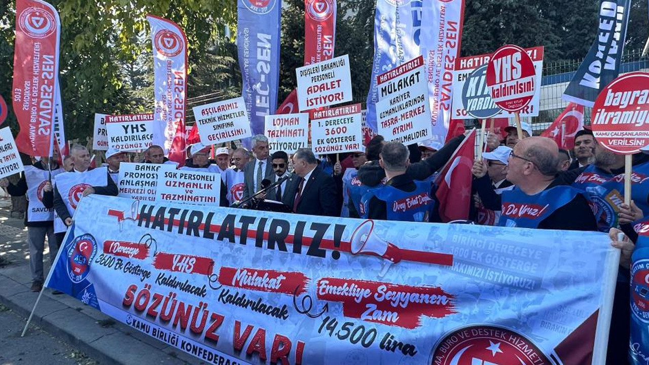 Kamu Birliği Konfederasyonu'na bağlı Savunma, Büro ve Destek Hizmetleri Sendikası (SAVDES-SEN) ve Türk Eğitim Çalışanları Sendikası (TEÇSEN) üyeleri tarafından Çalışma ve Sosyal Güvenlik Bakanlığı'nın önünde oturma eylemi gerçekleştirildi. Eylemde memurlar, ‘3600 ek gösterge 1. dereceye', ‘Mülakat kaldırılacak', ‘Enflasyon farkı aylık olarak verilsin', ‘Dışişleri Bakanlığı personeli adalet istiyor' ve ‘Sözünüz var, YHS kaldırılacak' yazılı pankartlar taşıdı.