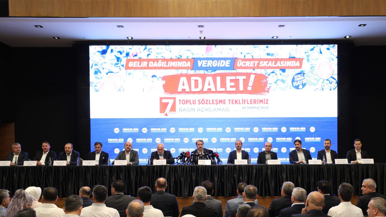 Memur-Sen Genel Başkanı Ali Yalçın, sendikanın genel merkezinde basın toplantısı düzenleyerek, kamu görevlilerinin 2024-2025 yıllarını kapsayan mali, sosyal ve özlük hakları ile çalışma şartlarını düzenleyen 7’nci Dönem Toplu Sözleşme teklifini paylaştı. Toplu sözleşmenin; hakkı temin etmenin, eksiklikleri gidermenin, beklentileri hayata geçirmenin ve sosyal maliyeti önlemenin en kilit anahtarı olduğunu belirten Yalçın, "Memur-Sen olarak; emeğin ve alın terinin karşılığını almak, 6 milyondan fazla kamu görevlisi ve emeklisinin mağduriyetini önlemek ve adil olanı hayata geçirmek için Toplu Sözleşme masasına da sosyal diyalog zeminine de her zaman önem veriyoruz" dedi. Tekliflerin sunumundan sonra kamu işvereni için 1 hafta süre olduğunu hatırlatan Yalçın, bu süre içerisinde kamu işvereninin teklifleri tasnif edip, ayrıştırıp 1 Ağustos itibarıyla masaya teklifle gelmesini talep ettiklerini söyledi.