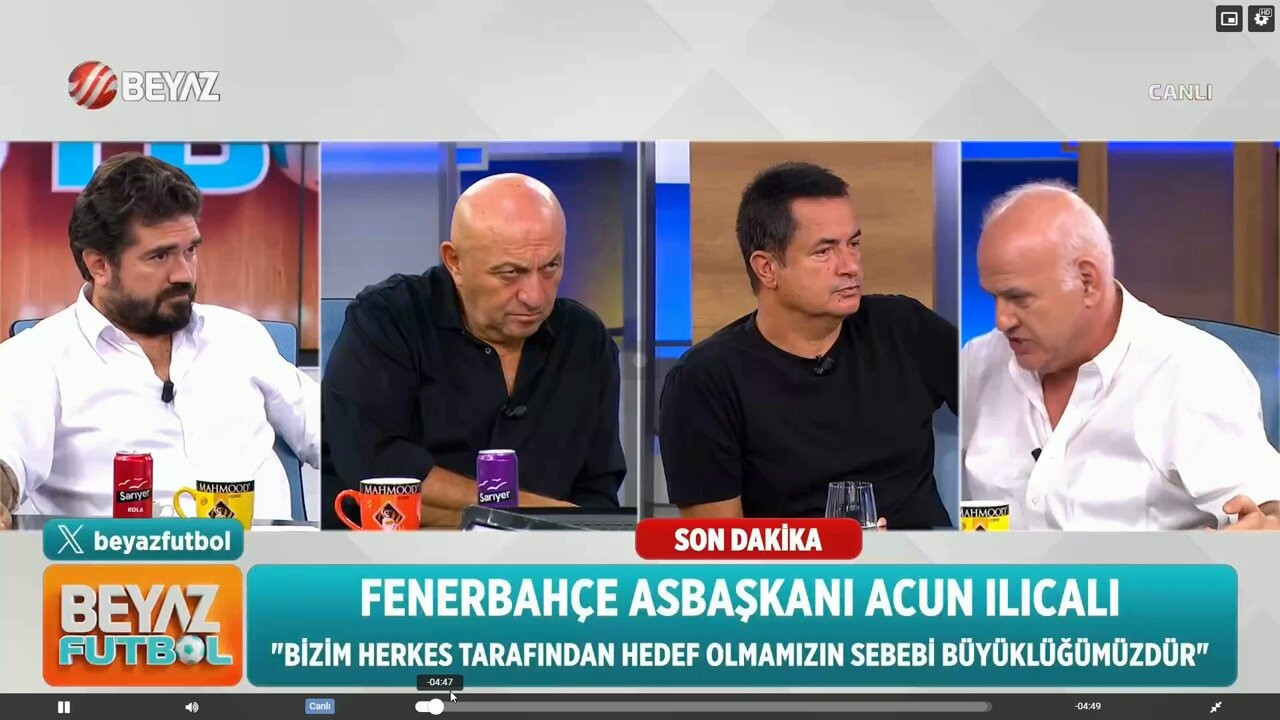 Beyaz TV'de canlı yayın konuğu olan Fenerbahçe Asbaşkanı Acun Ilıcalı, yaptığı açıklamalarla dikkat çekerken, canlı yayına Ilıcalı'nın Ahmet Çakar ile aralarındaki tartışma damgasını vurdu.
