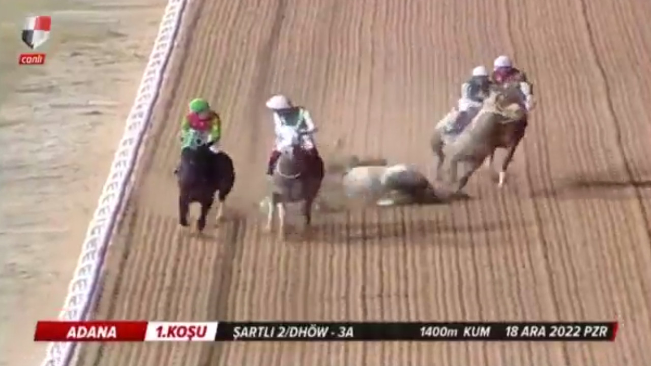 Adana’da bugünkü altılı ganyanın 1. koşusunda bir at feci şekilde devrildi.