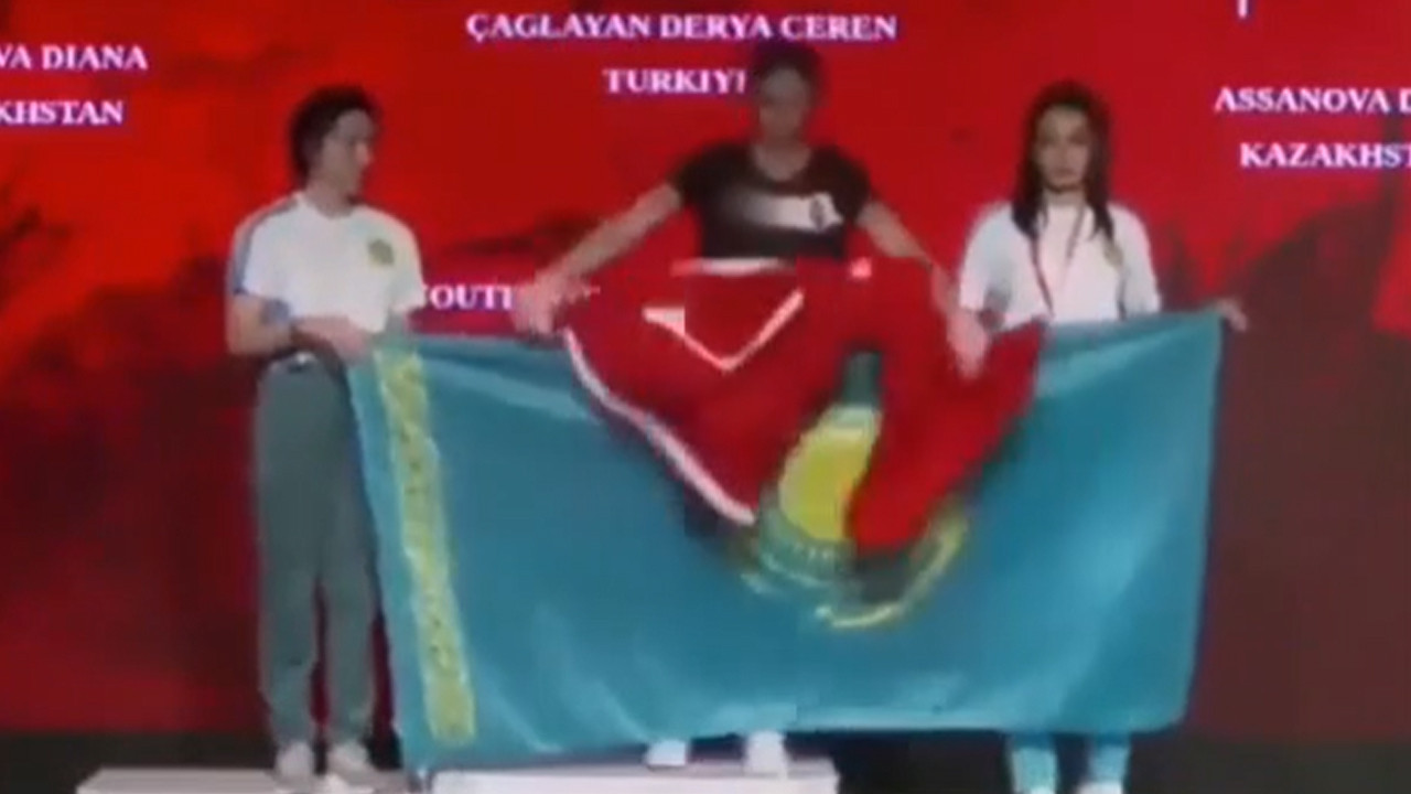 Türk bayrağını kapatmaya çalışan Kazak sporcuların davranışlarını engelleyen sporcumuz Derya Ceren Çağlayan'ın o hamlesi ödül törenine damga vurdu.