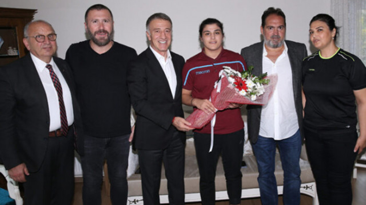 Trabzonspor Kulüp Başkanı Ahmet Ağaoğlu, Asbaşkan Mehmet Yiğit Alp ve amatör branşlardan sorumlu yönetim kurulu üyesi Yusuf Hayırlıoğlu, dünya şampiyonu olan milli boksör Busenaz Sürmeneli’yi evinde ziyaret etti.