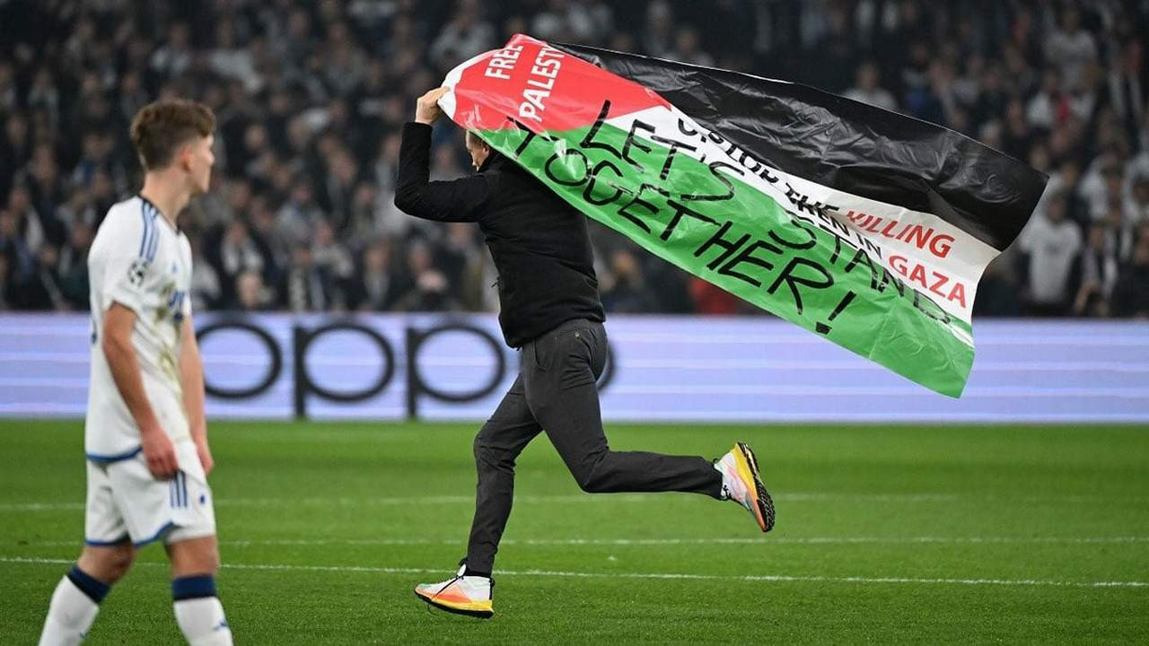 Henüz oyunun başında bir taraftar, dikkat çeken bir eylemde bulundu. Danimarka'daki Parken Stadyumu'nda oynanan mücadelede sahaya giren bir taraftar, tüm dünyaya işgal altındaki Filistin'e destek mesajı verdi.
