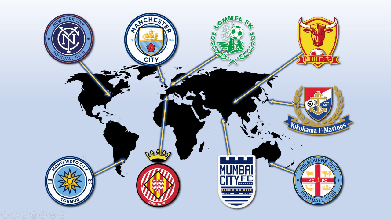 Manchester City, New York City, Melborne City, Yokohama F. Marinos, Montevideo City Torque, Girona FC, Schuan Jiuniu, Mumbai City FC, Lommel SK, Esparence Sportive Troyes, Palermo, Bahia, Club Bolivar City Futbol Grup bünyesinde olan kulüpler...