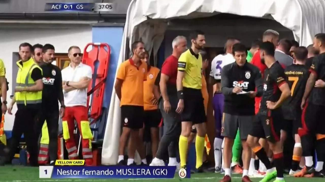 Hakeme tepki gösteren Muslera, itirazları sonucu sarı kart gördü. Teknik direktör Okan Buruk sahaya girerek oyuncusunu sakinleştirirken, Fernando Muslera ses bombasının atıldığı yöne doğru gitti ve taraftarlara "Lütfen sakin olun" dedi.