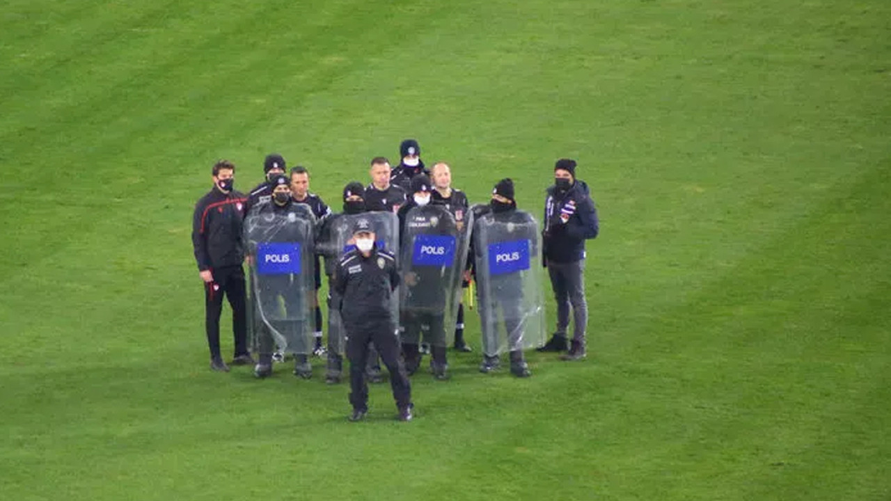 Çevresi polis ekiplerince kapatılan hakemler Hüseyin Göçek, Kamil Çetin ve Candaş Elbil, çevik kuvvet ekiplerince oluşturulan koridor eşliğinde yaklaşık 20 dakika sonra soyunma odasına geçebildi.