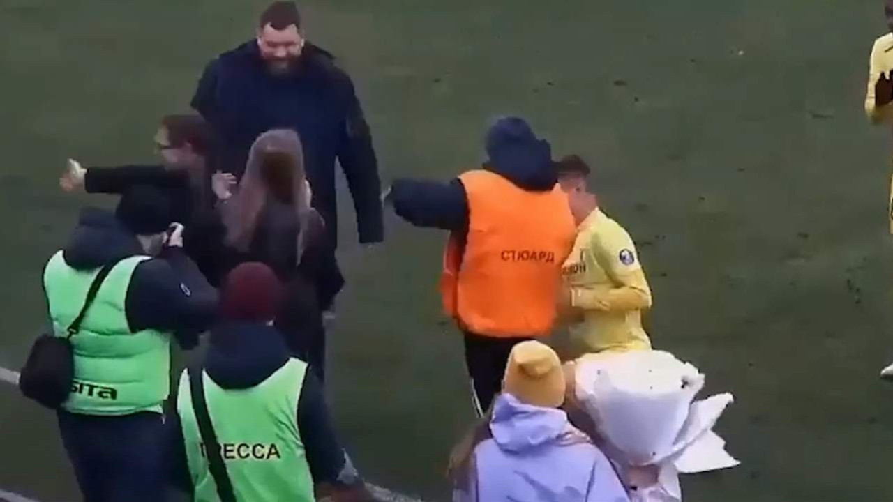 Evlilik teklifinden habersiz olan güvenlik görevlisi sert şekilde kadını sahanın dışına itti. Futbolcunun güvenlik görevlisine müdahalesiyle gerginlik çıktı.