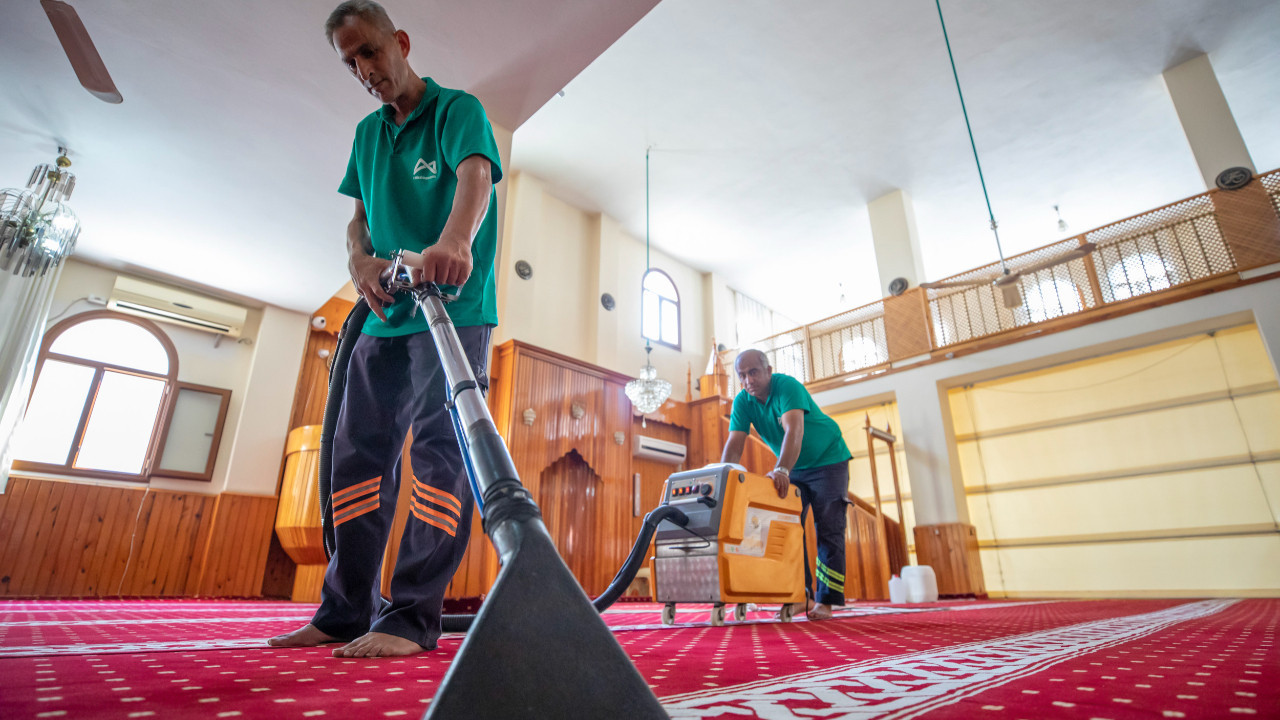 Mersin’in 13 ilçesinin tamamında ibadethanelerin temizliği için oluşturulan ekipler, haftanın 7 günü, vatandaşların ibadetlerini temiz ve sağlıklı bir mekanda yapmaları için özveri ile çalışıyor. İbadethane temizlik ekibi, program dahilinde her gün, farklı ibadethanelerin temizliğini yapıyor. Günlük temizlik rutinleri olan ekipler, ibadethane temizliği kapsamında halıları özel bir makine ile yıkıyor. Ardından ibadethanelerde kapı, pencere, ayakkabılık gibi alanlara genel temizlik uygulanıyor. Halı yıkama, süpürme ve genel temizlik işlemlerinin ardından, son olarak gül suyu sıkılıyor.