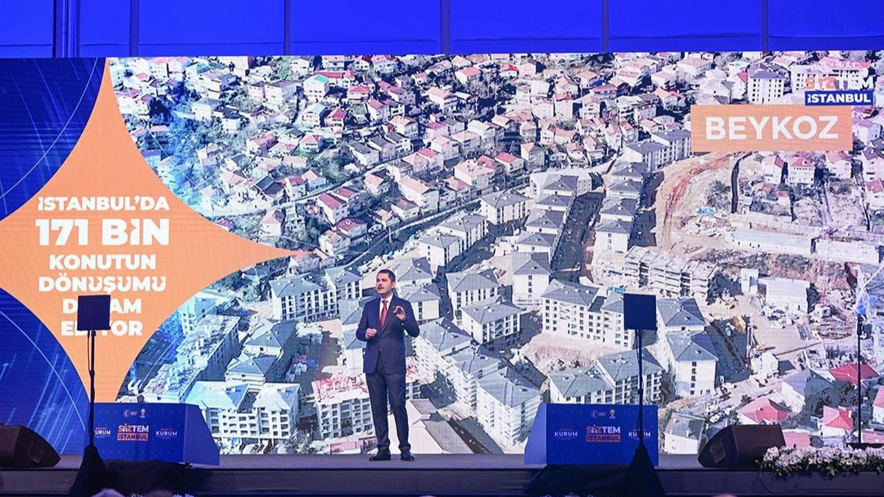 İstanbul kimliğini her yatırımımıza yansıtacağız. Görenler "işte bu İstanbul mimarisi" diyecek. Türkiye'nin kentsel dönüşüm seferberliğini İstanbul'dan başlatmış kadrolarız. 1 milyon 300 bin konutu milletimiz ile el ele verip inşa ettik. İstanbul'da 12 yılda 800 bin bağımsız bölümü yeniledik. İstanbul'un herhangi bir mahallesine giderseniz bizim dönüşüm çalışmalarımızla karşılaşırsınız. Yapılarımız reklama algıya ihtiyaç duyulmadan seferberlik ruhuyla dönüşüyor. Mevcut ibb yönetimi dönüşüm hareketinin bir paydaşı olmadı. İBB yönetimindekiler maalesef çalışmadı, üretmedi. deprem seferberliği ilan ediyoruz dediler ortada eserleri yok. Depreme hazırlarız dediler hazırladıkları yok. 15 bin sosyal konutu süratle bitireceğiz dediler, yine sözlerini tutmadılar. Bu vaatleri de inkar etmeye başladılar. Ayıplarını hüner gibi göstermeye çalışıyorlar.